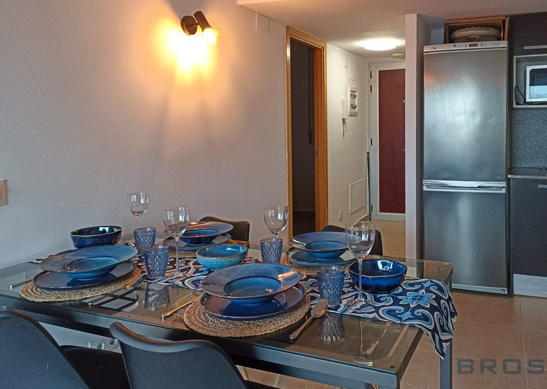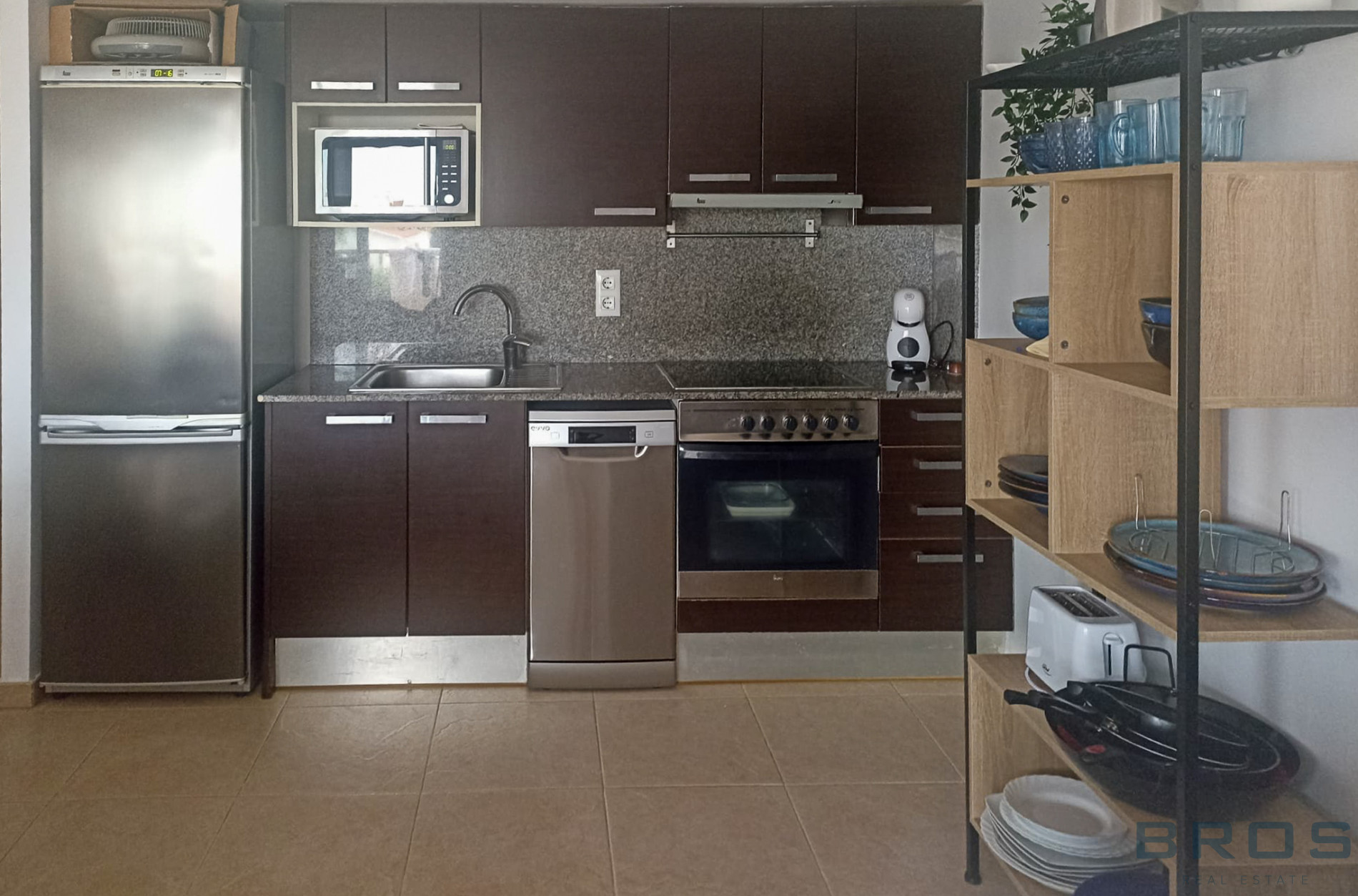 Fully equipped open-plan kitchen with stainless steel appliances: oven, ceramic hob, dishwasher, refrigerator, and microwave.