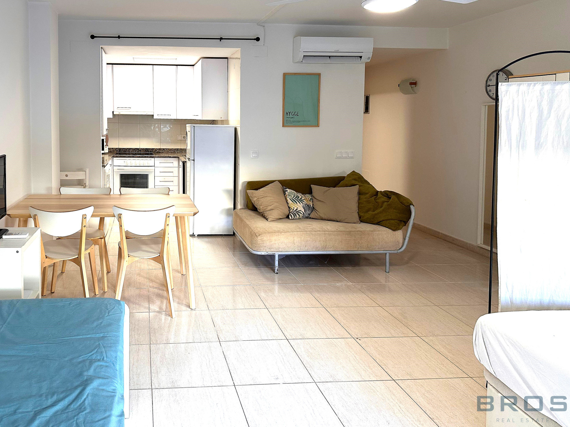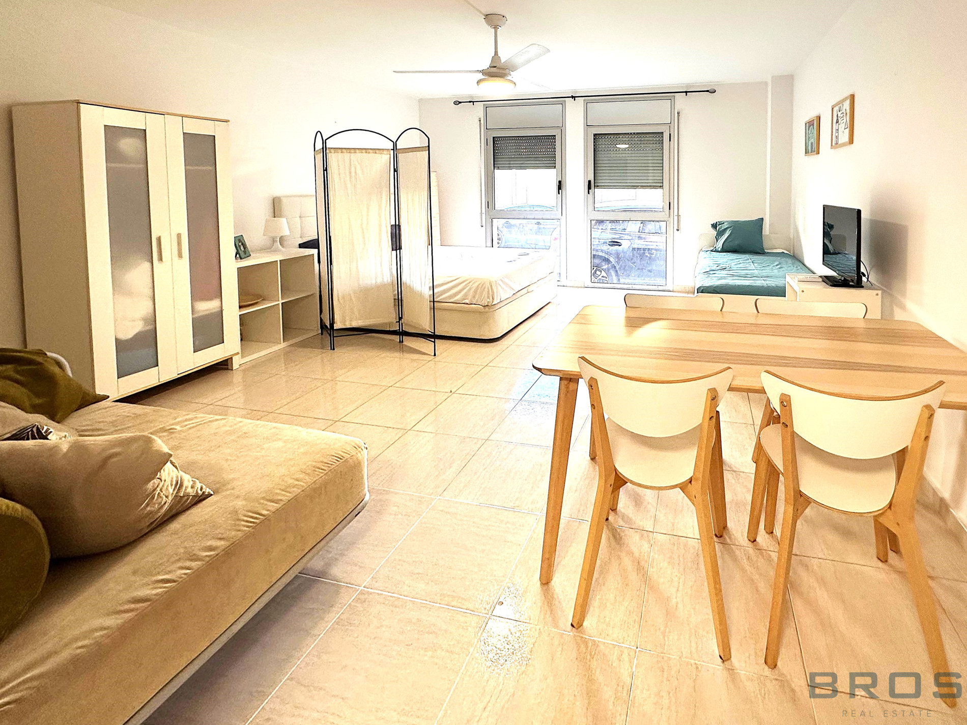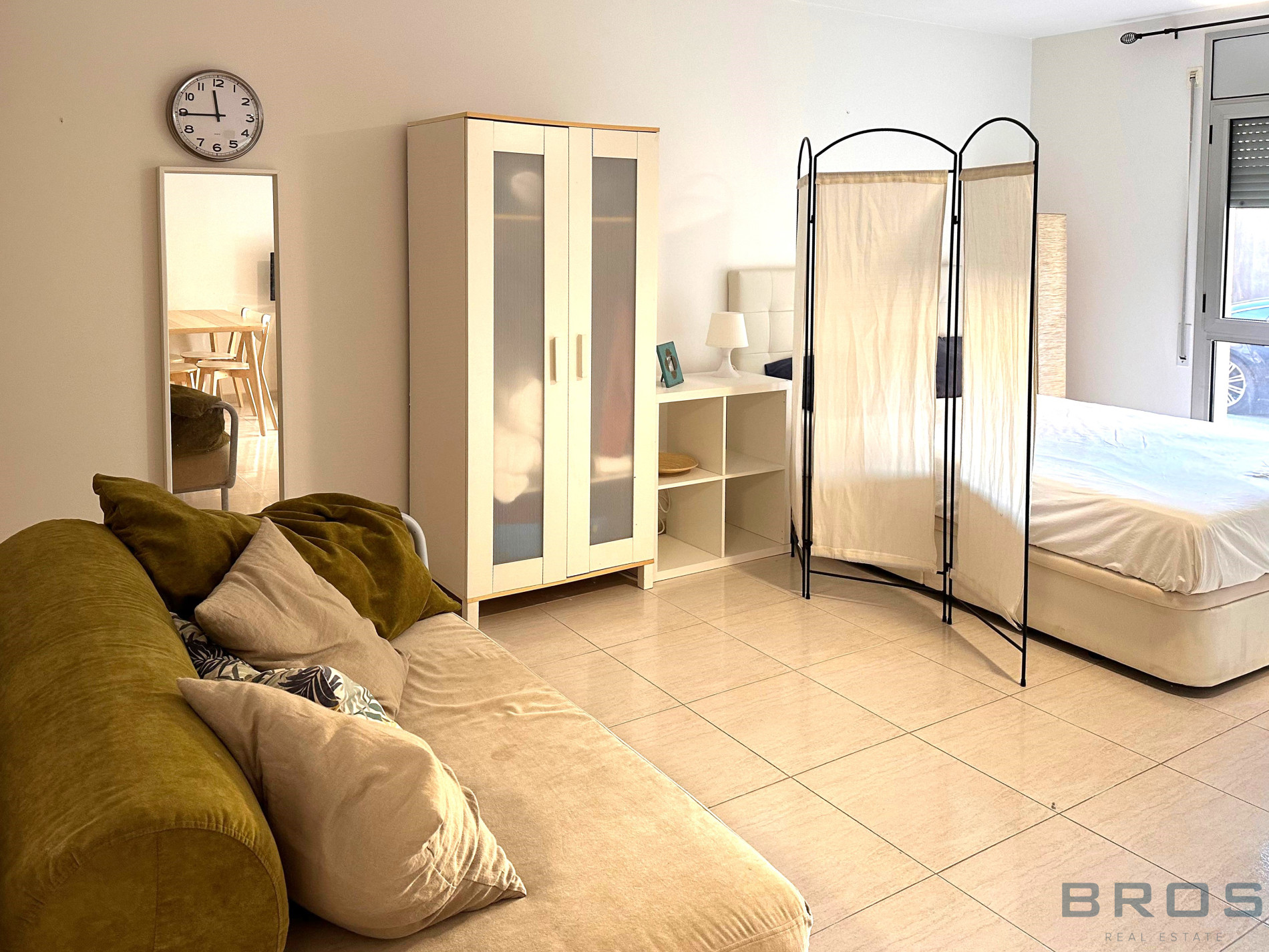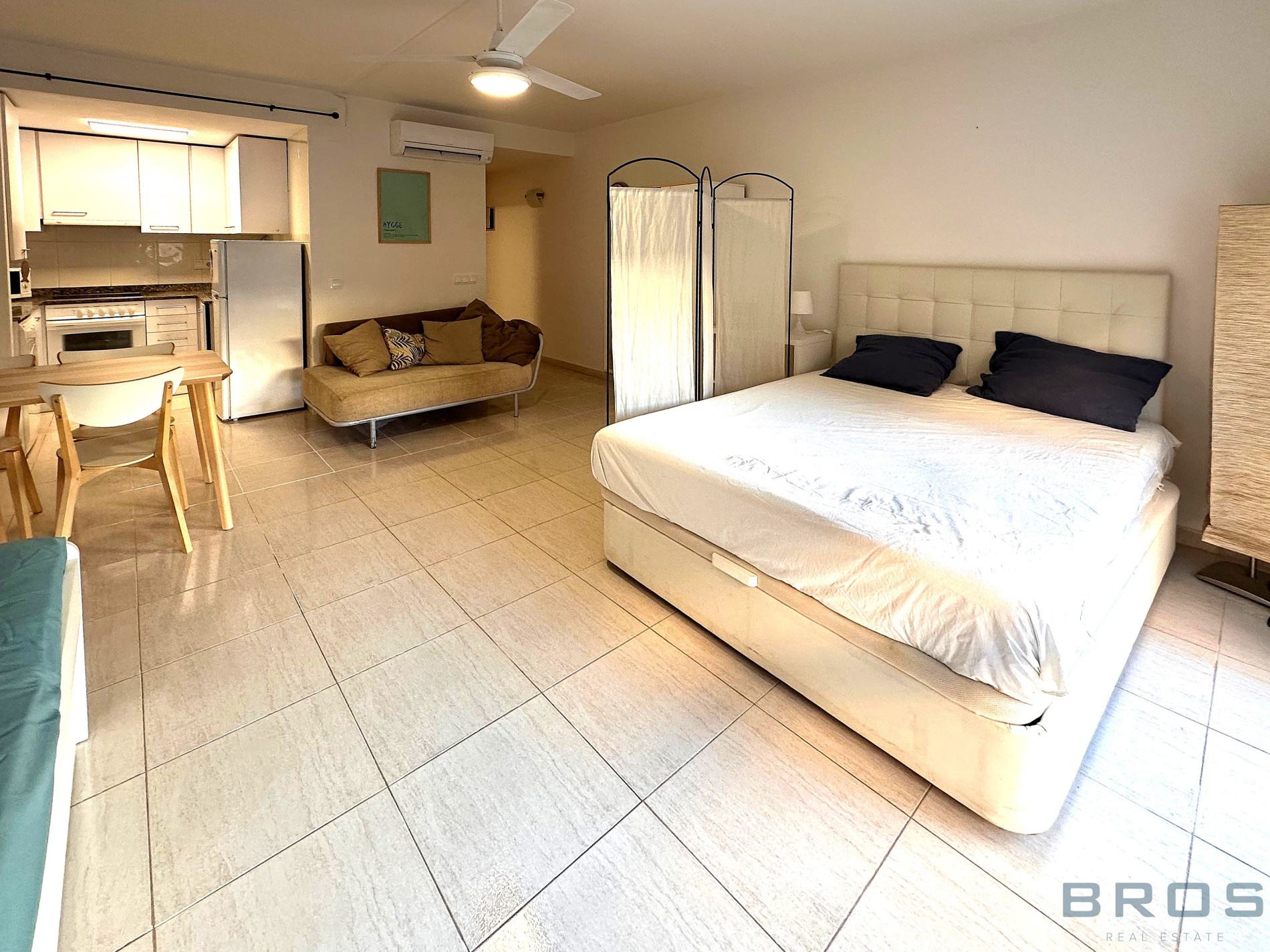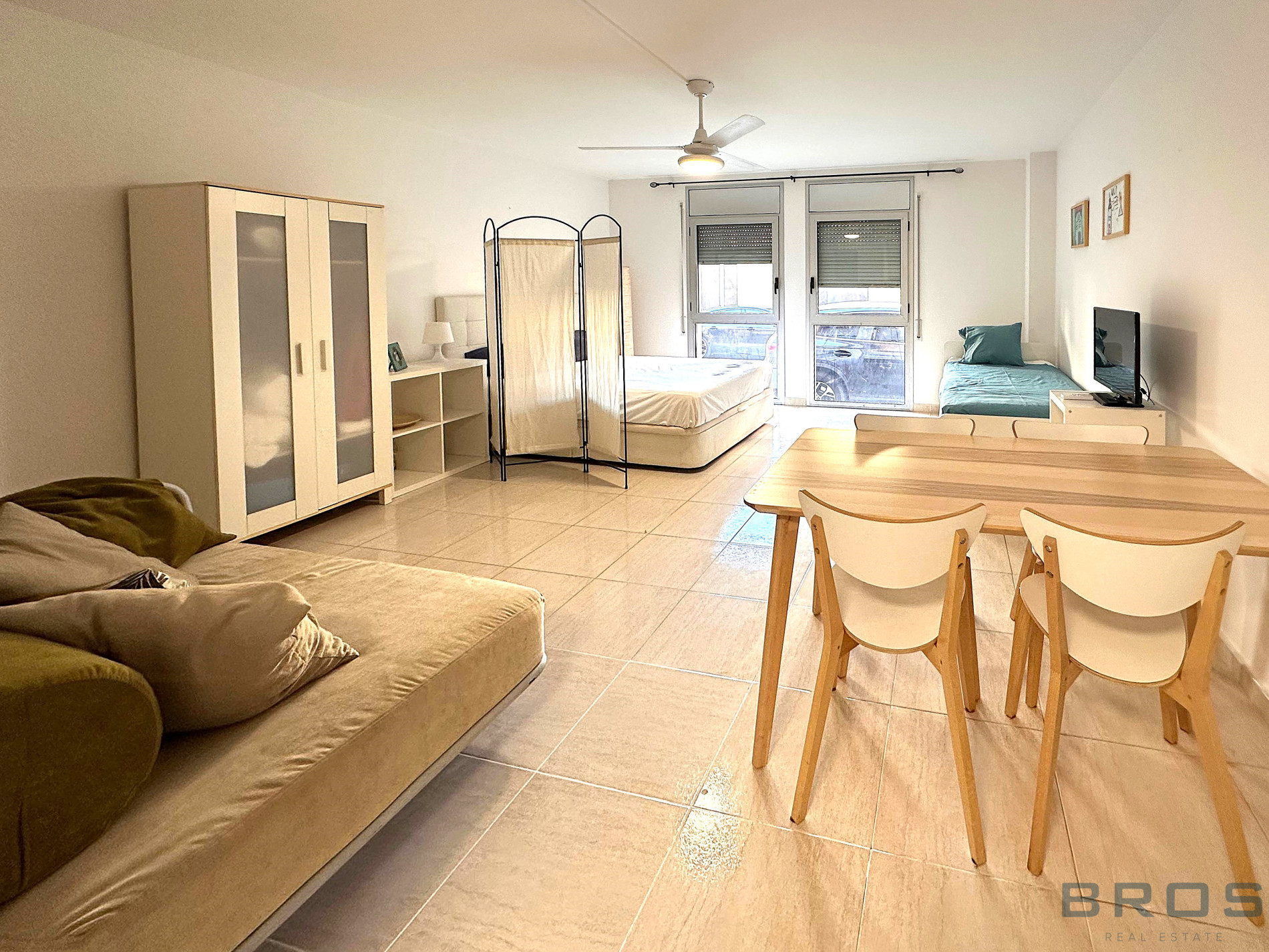 Studio situé au rez-de-chaussée de 38 m2 qui dispose d'un hall et d'un espace ouvert dans lequel se trouve un salon-salle à manger avec une cuisine ouverte, un coin nuit et une salle de bain.
