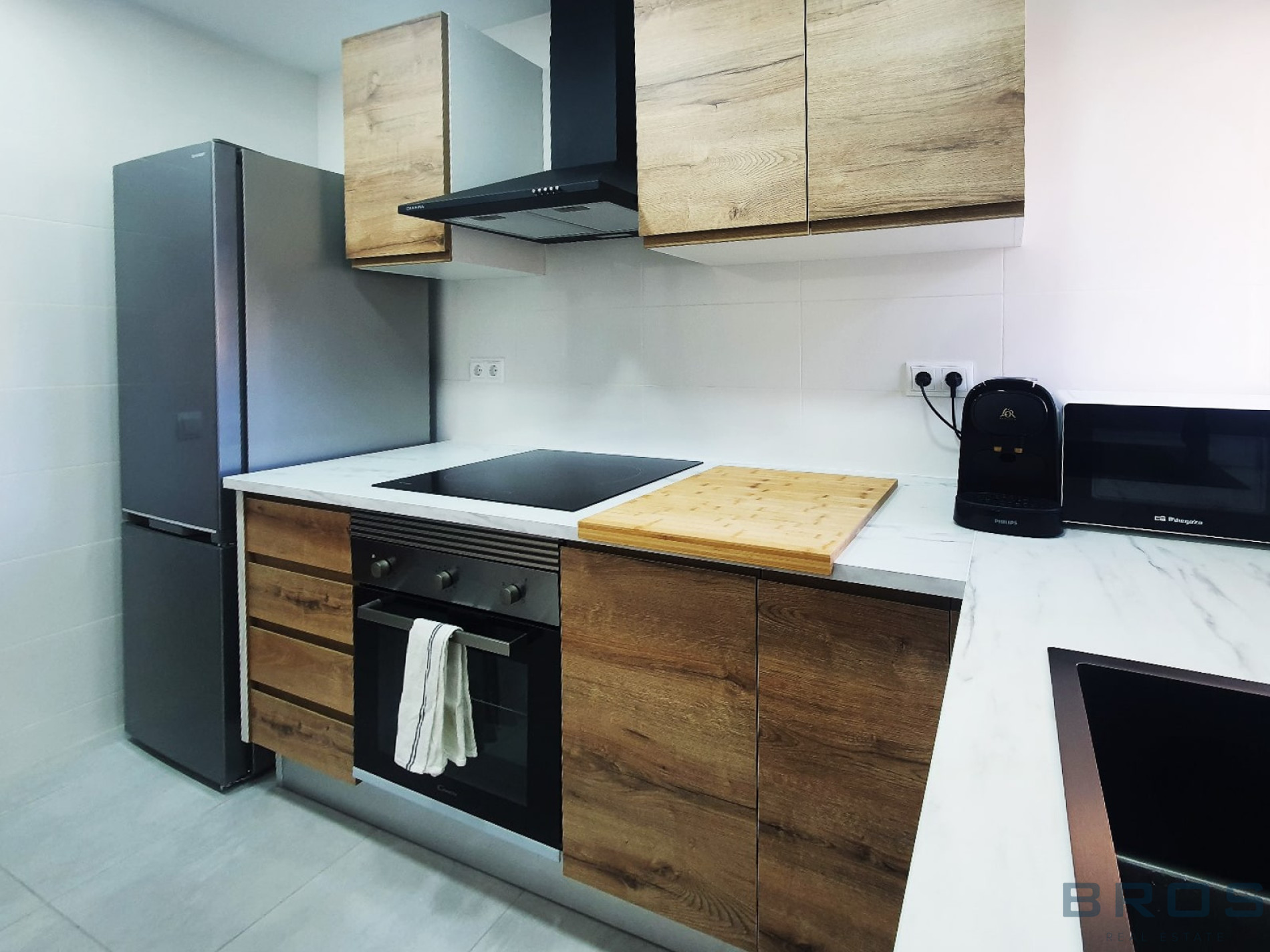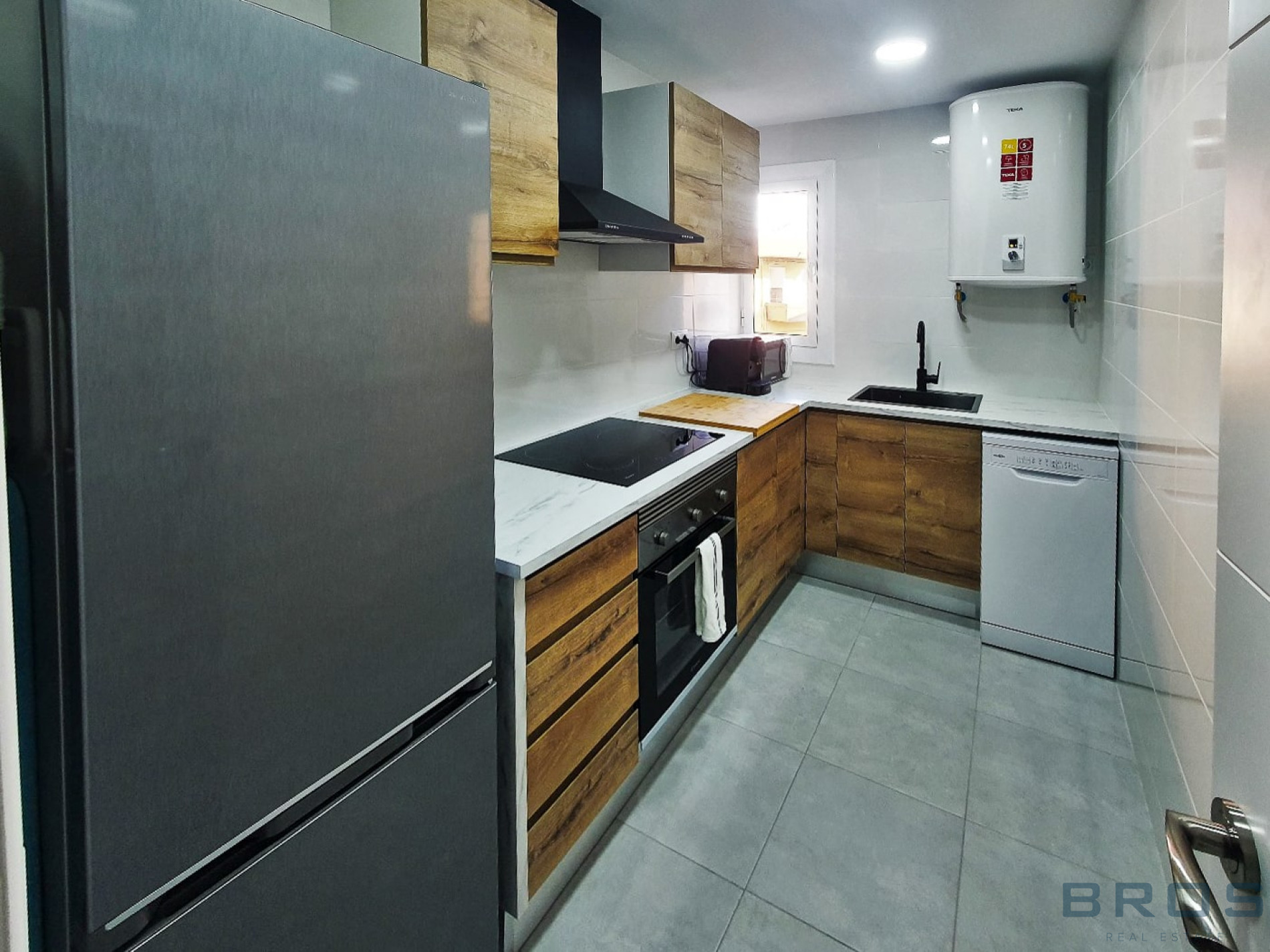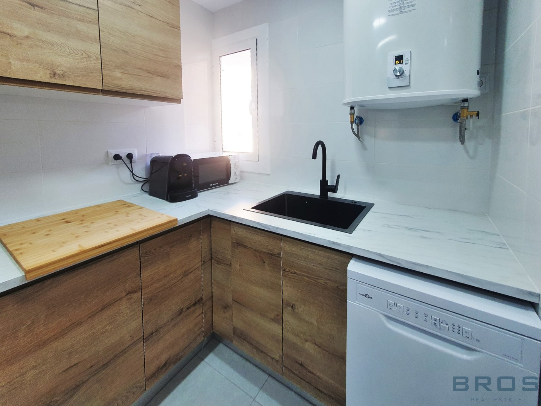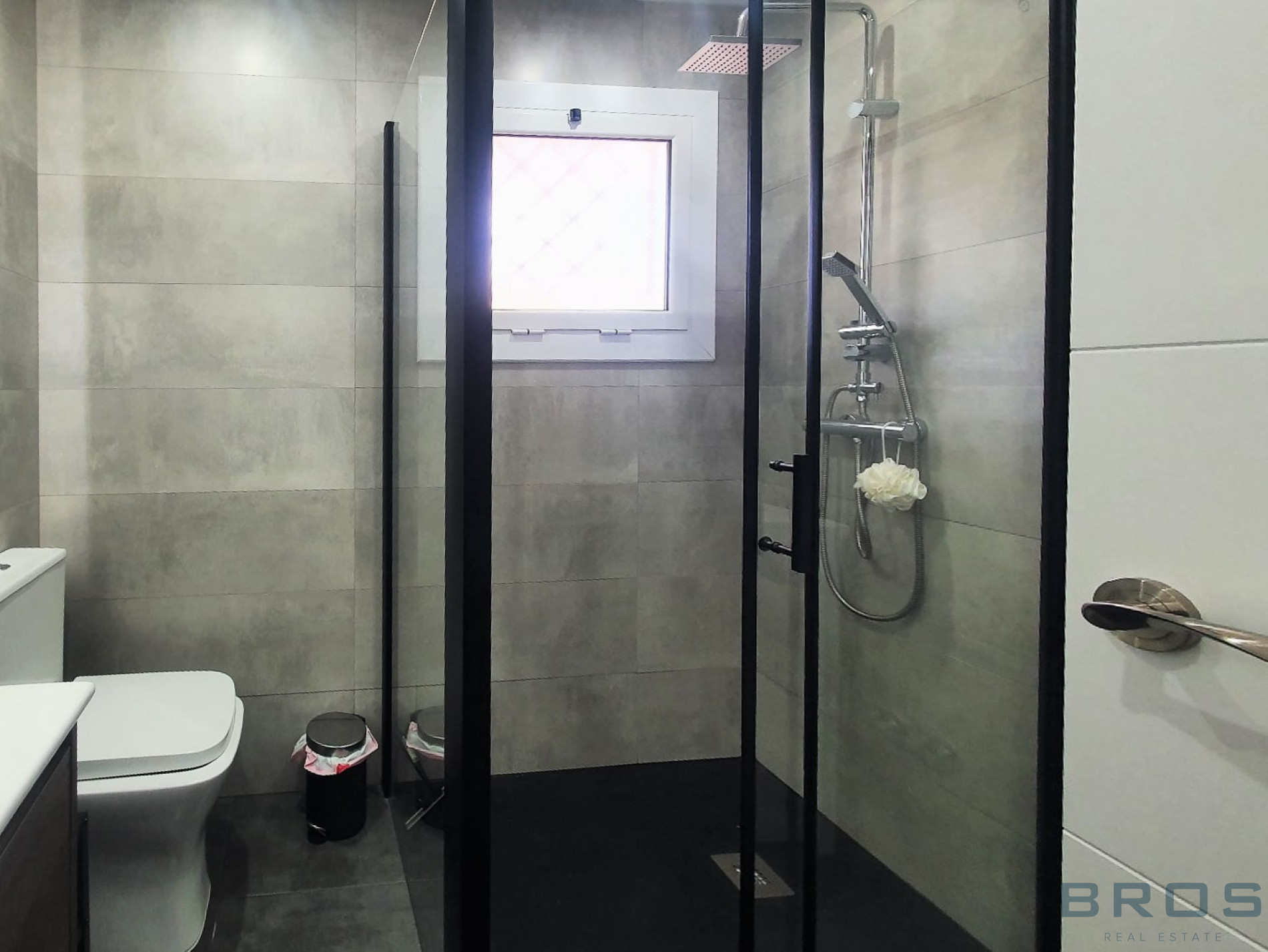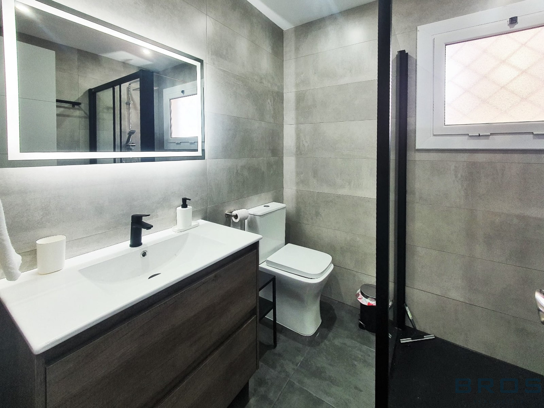 - Cuisine et Salle de Bain Rénovées: Depuis le salon, vous accédez également à la cuisine entièrement équipée et rénovée, ainsi qu’à la salle de bain, modernisée avec une paroi en aluminium noir et des carreaux de grès gris, ajoutant une touche moderne et élégante.
